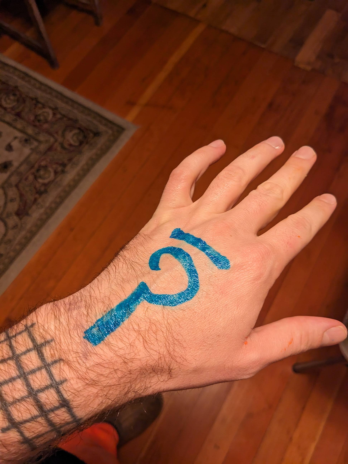 The metallic blue erasable tattoo marker worked alright and we had some cool designs, but this just wasn't exciting enough to go very far. We had a few tattoos like this and then were done.
